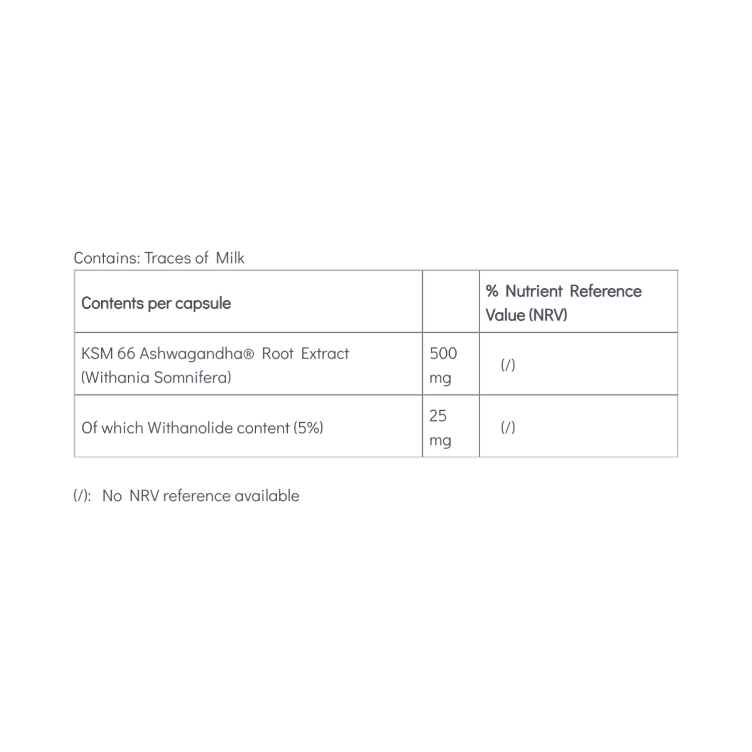 Ingredients: KSM 66 Ashwagandha® Root Extract (Withania somnifera), Microcrystalline cellulose (bulking agent)